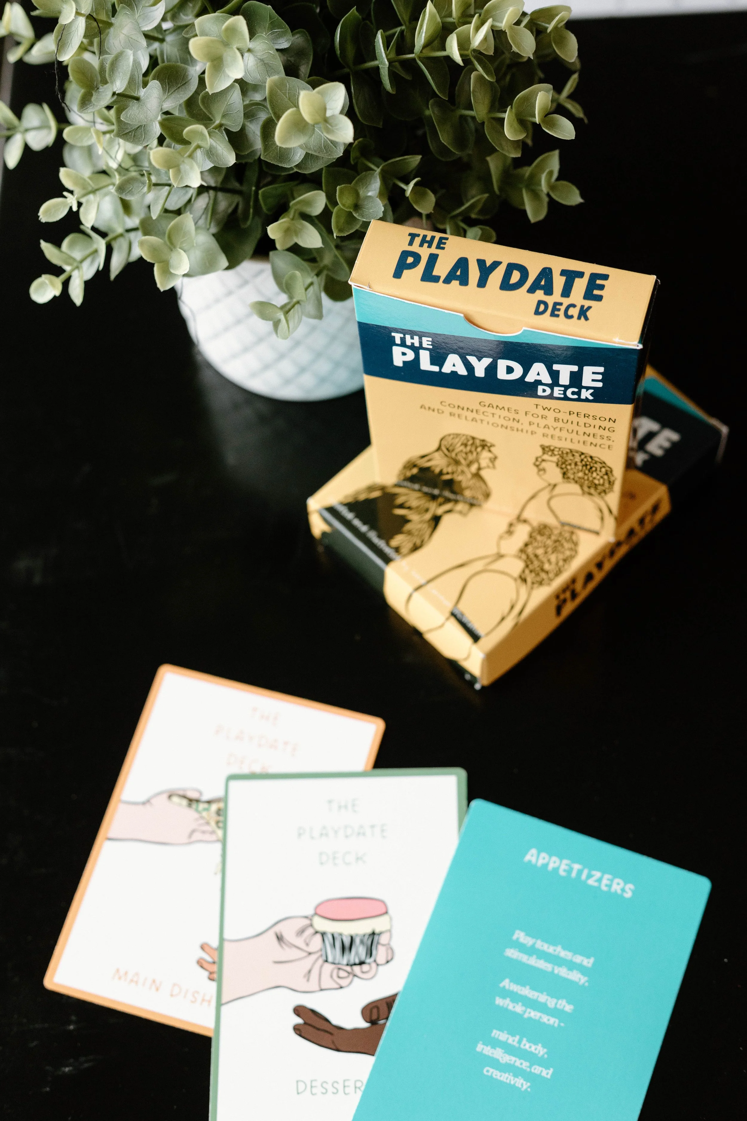 I am seeing a new guy, and things are going great. As part of our most recent date, we did an app, main dish, and dessert game from your deck. They did amazingly at setting our mood and building connection. I had the most wonderful day, and The Playdate Deck was a huge part of it. I even played one with my friend's 5-year-old son. He loved it, and now he wants to play the "play pretend cards" all the time.